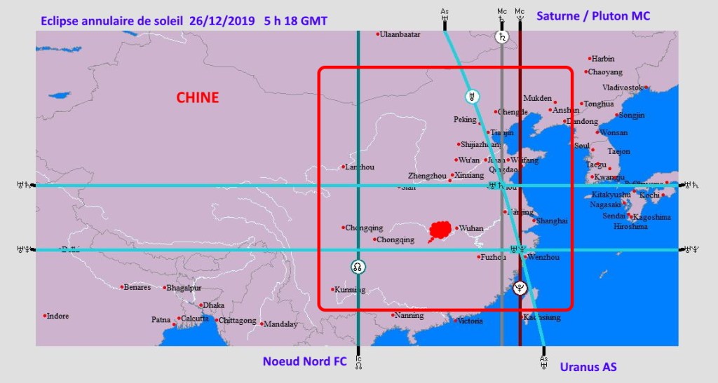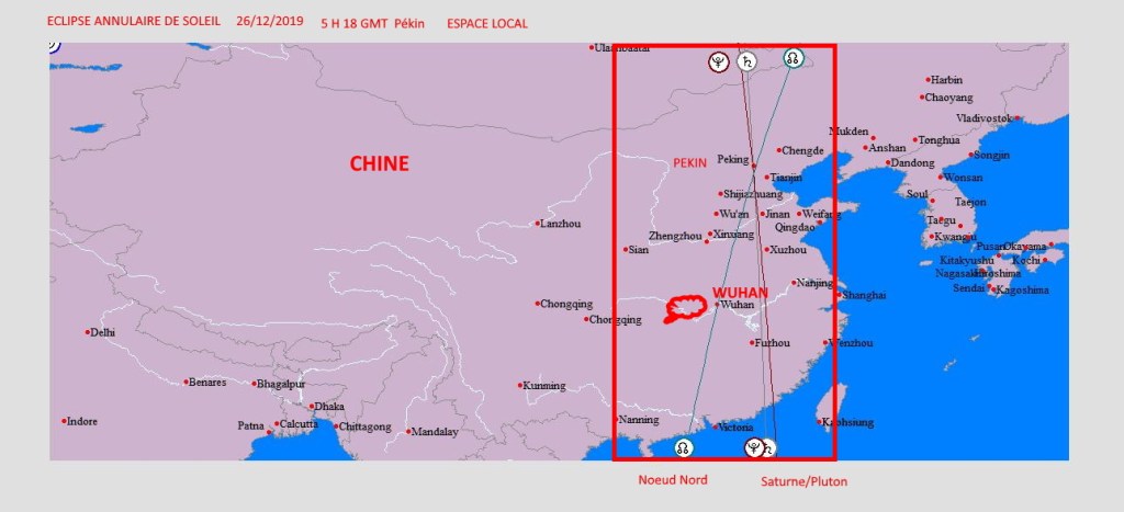 La projection sur la Chine, de la dernière éclipse de l’année 2019, montre un alignement de Saturne et Pluton ,particuliérement dissonant au niveau de Wuhan,le foyer de l’épidémie.