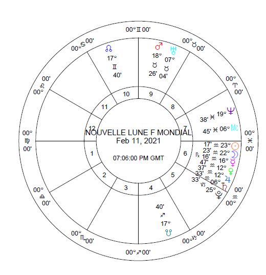 Astro-Localisation de la nouvelle lune du 11/2/2021 19 h 06 TU au plan mondial