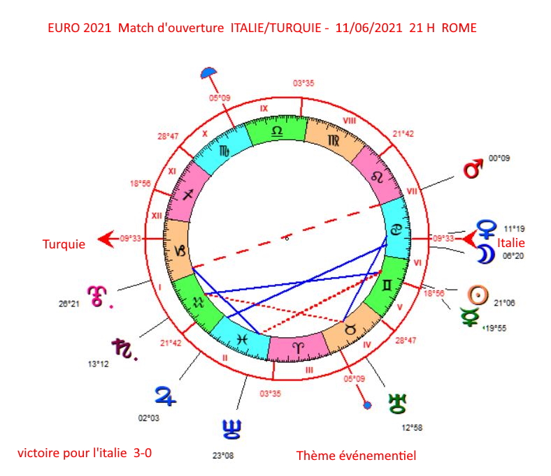 L’Italie,d’entrée de jeu,est avantagée par sa position au descendant 9 °33 cancer,conjoint à la lune et vénus en lieu d’élection dans le cancer, de plus,lune et vénus gouvernent la maison 4 en taureau qui représente la conclusion.