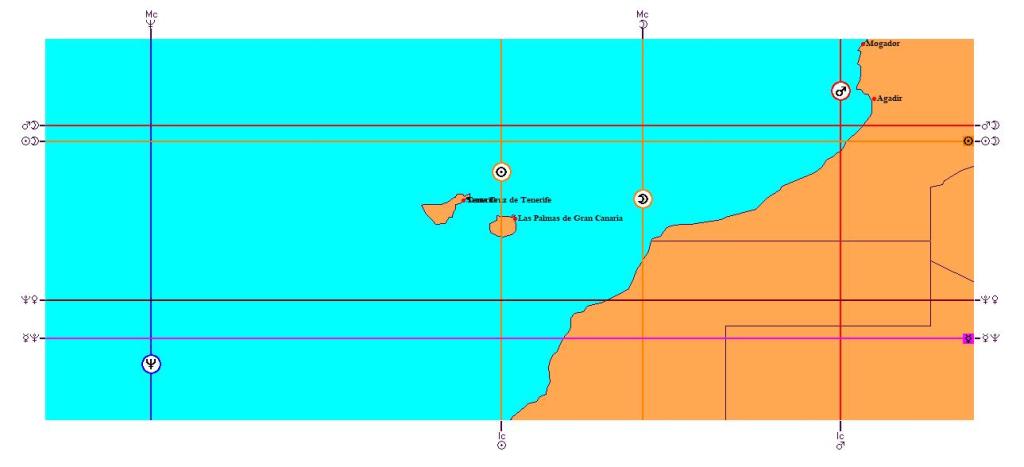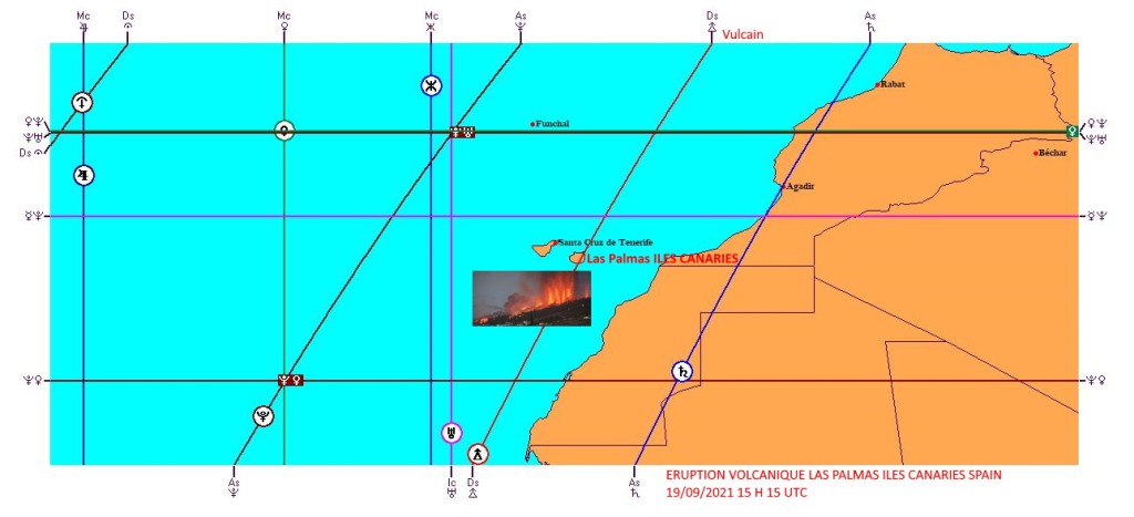 Ci- dessus,sur le graphique d’astro-localisation, établi d’après la date du déclenchement de l’éruption,la ligne de Vulcain au DS passe exactement sur Las Palmas-