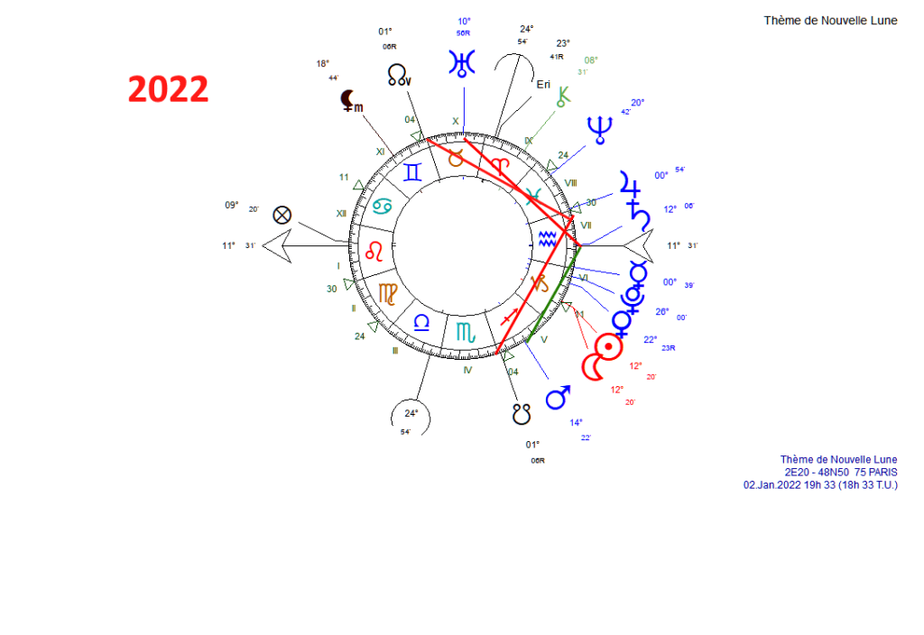 En ce début d’année,la Nouvelle Lune reliée à Uranus /taureau parle plutôt d’ astreintes nouvelles,Saturne toujours en dissonance avec Uranus, gouverne cette lunaison en maison 6 située à 12 °capricorne. .Le secteur 6 étant occupé par le soleil,la lune,vénus ,pluton et mercure,met en évidence les problémes sanitaires du moment.Mars en quadrature de Neptune ne rassure pas davantage.L’épidémie gagne du terrain.
