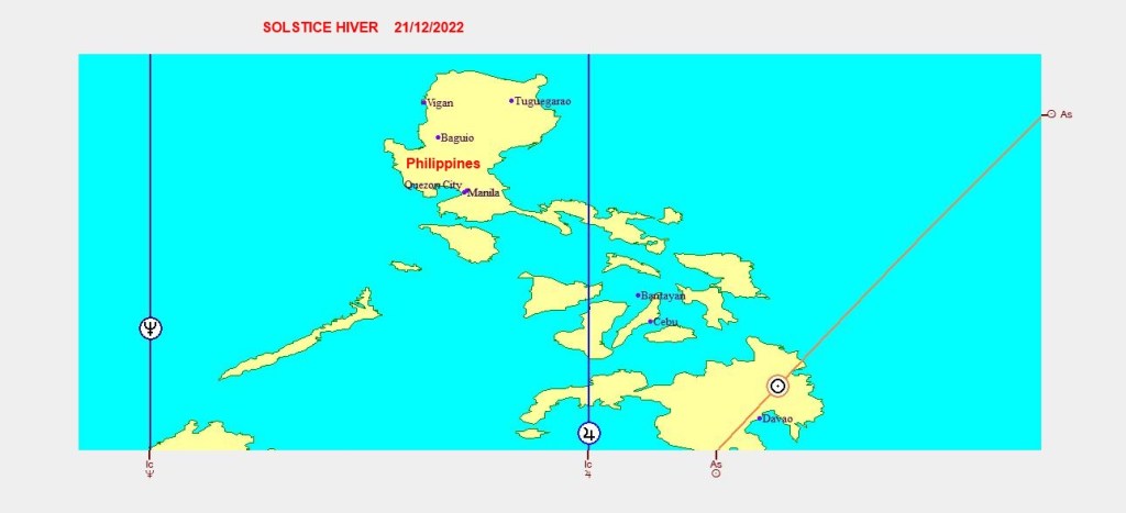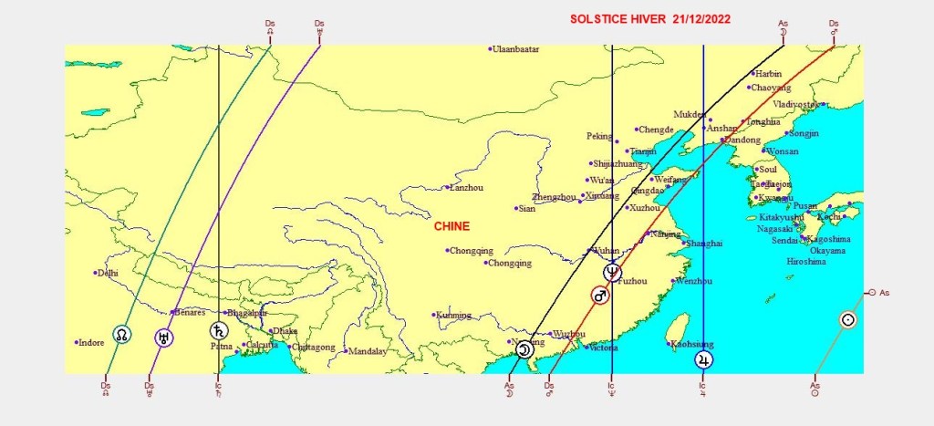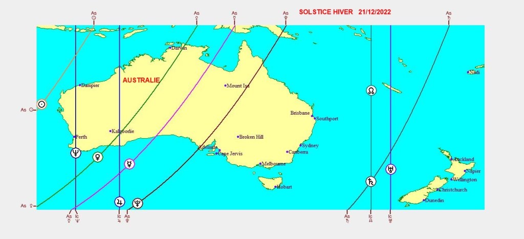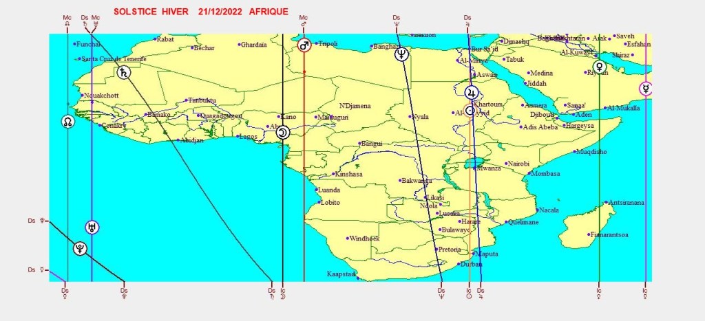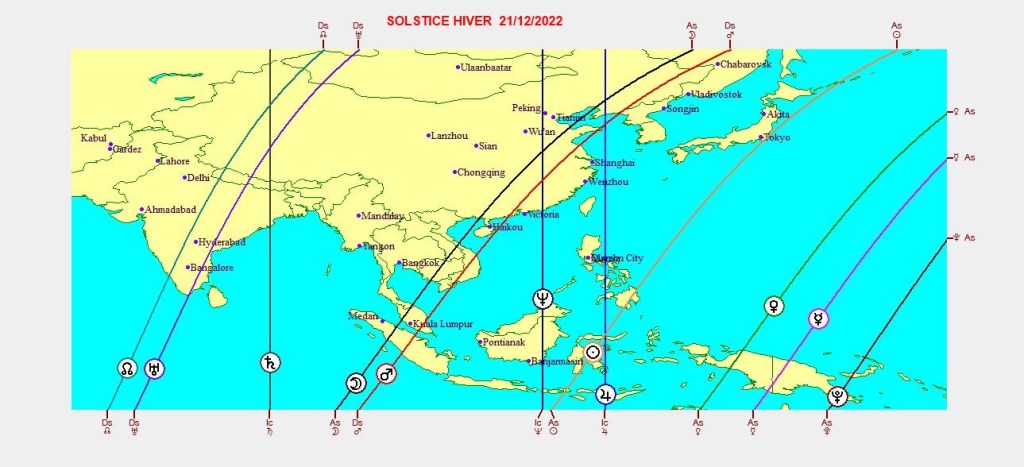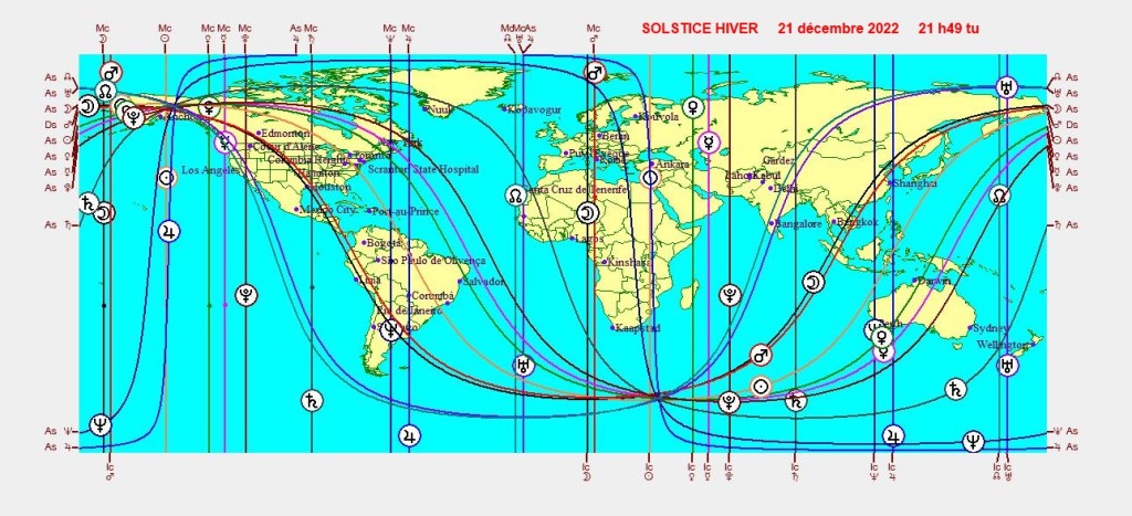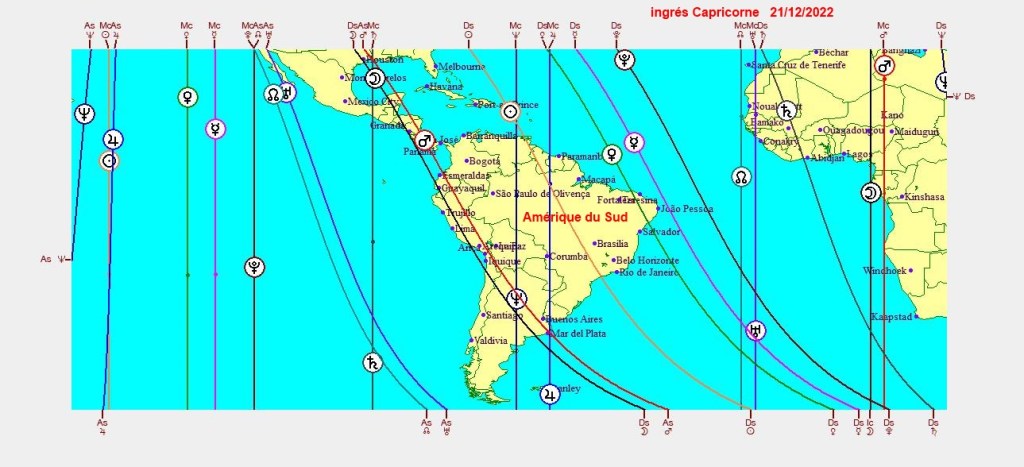Les cartographies ci-dessus représentent la projection de l’ingrès du Capricorne du 21/12/2022,sur les différentes parties du globe.Chaque ligne angulaireMC-FC-AS-DS exprime son influence maximale dans certaines zones