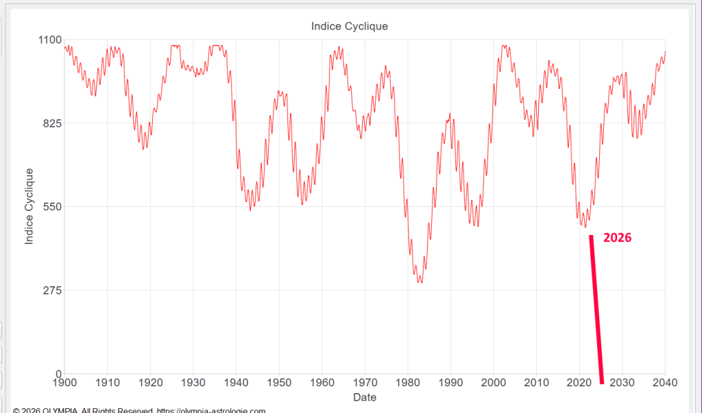 L’ indice cyclique en astrologie est un indicateur statistique qui mesure la distribution des planètes lentes autour du zodiaque, et sert surtout en astrologie mondiale pour repérer les périodes de tension ou de détente à l’échelle planétaire. L’indice cyclique se calcule à partir des positions héliocentriques des planètes de Jupiter à Pluton (ou plus largement les dix planètes selon certaines variantes) au 1er janvier de chaque année. On additionne les écarts angulaires entre ces planètes plus ceux‑ci sont petits (planètes groupées), plus l’indice est élevé, ce qui est souvent associé à des périodes de crises ou de grands changements.
